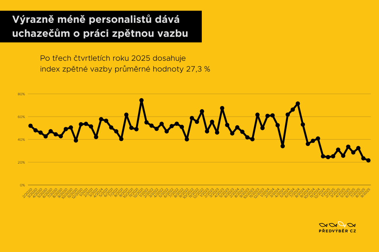 Ukazuje to průběžný průzkum personální agentury Předvýběr.CZ, která monitoruje přístup firem k uchazečům o práci. Za tři čtvrtletí letošního roku průměrná hodnota indexu zpětné vazby klesla na 27,3 %, což představuje nejhorší výsledek od začátku měření v roce 2020.