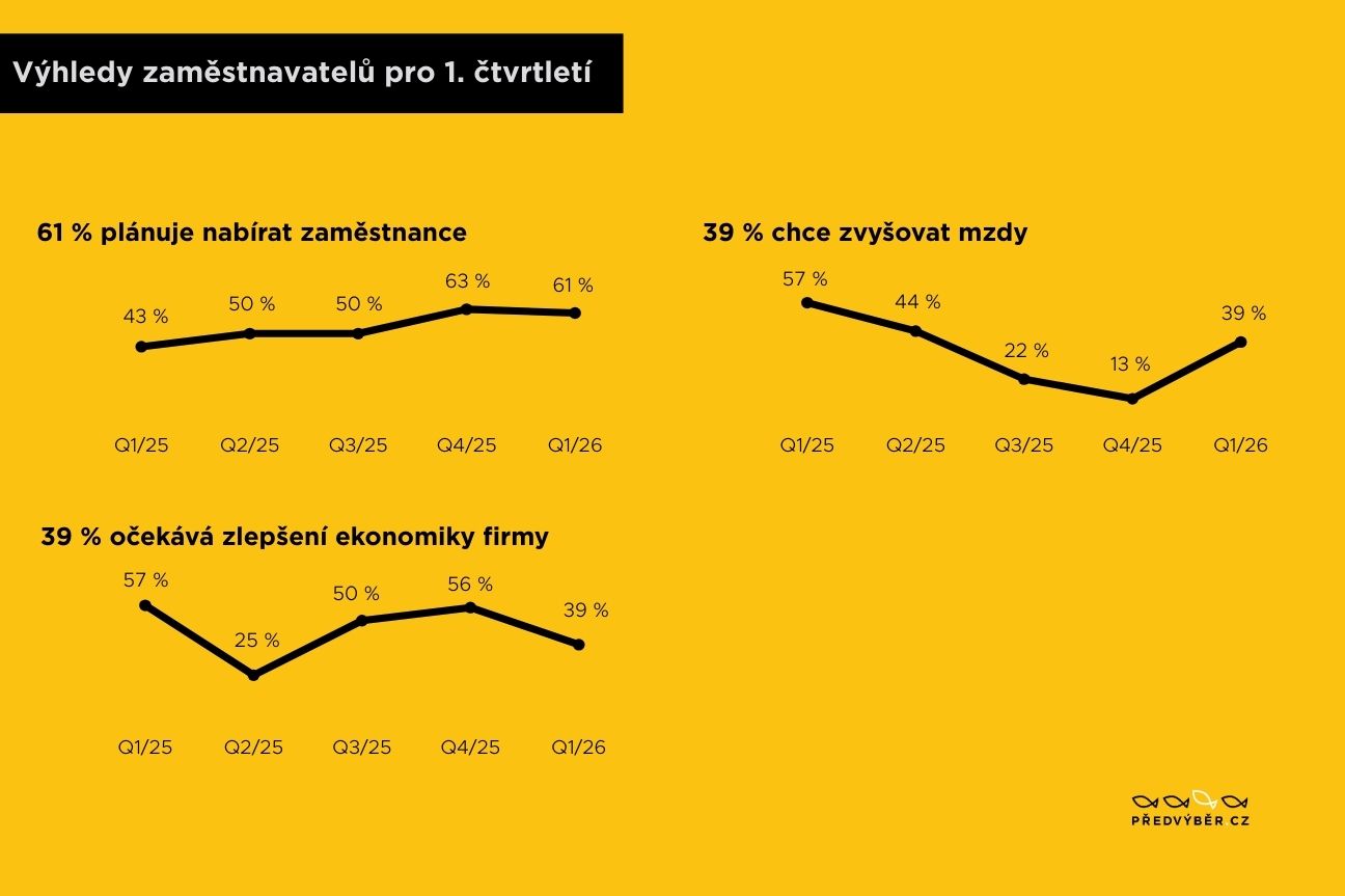 Ačkoli ubylo zaměstnavatelů, kteří očekávají v nejbližším období zlepšení své ekonomické situace, šest z deseti firem hledá nové zaměstnance a čtyři z deseti chtějí lidem vylepšit výplatu. Vyplývá to z pravidelného čtvrtletního online průzkumu personální agentury Předvýběr.CZ mezi stovkou stálých respondentů z řad majitelů, šéfů a personalistů firem.